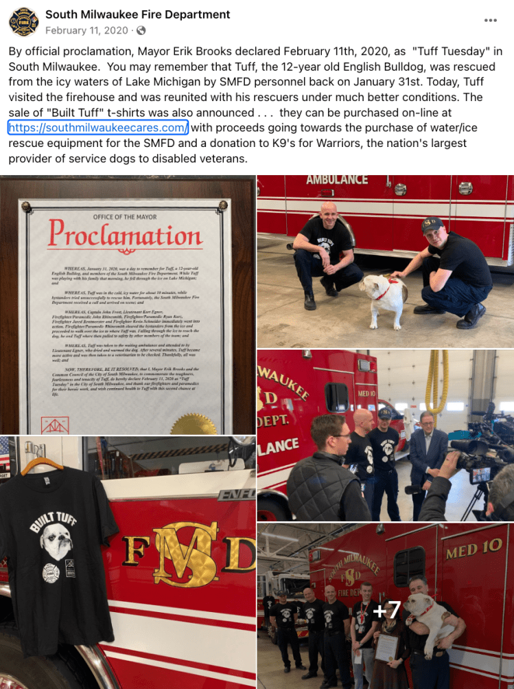 The city embraced the viral opportunity, from welcoming media to the firehouse to interview the rescuers and meet the human owner of Tuff, to declaring February 11, 2020, “Tuff Tuesday in South Milwaukee.” We also embraced an idea to extend the viral event, for charity. Working with a local apparel company and shipping business, the SMFD and mayor’s office unveiled a line of “Built Tuff” t-shirts and sold them online to raise money for K9s for Warriors, a charity that provides service dogs to disabled military veterans.